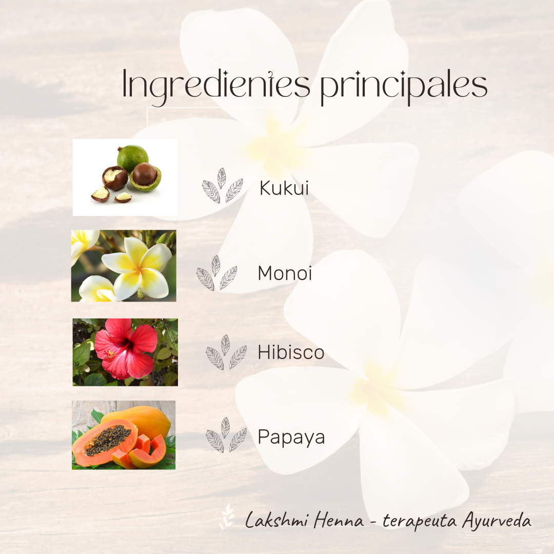 Ingredientes ( a medida ) kukui, Monoi, papaya, hibiscus, aceites y mantecas bio a medida, opcional perfumado o sin aroma con extracto de Monoi (el monoi utilizado en los ingredientes no contiene perfume)
