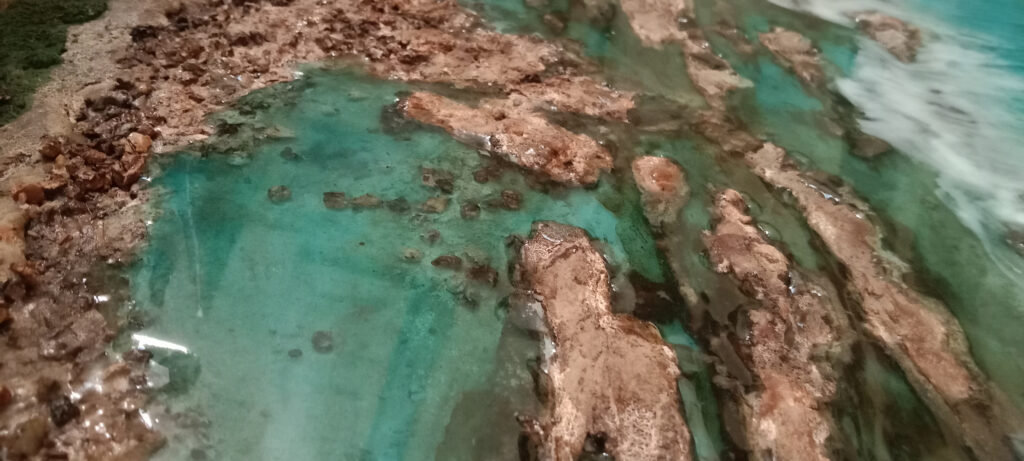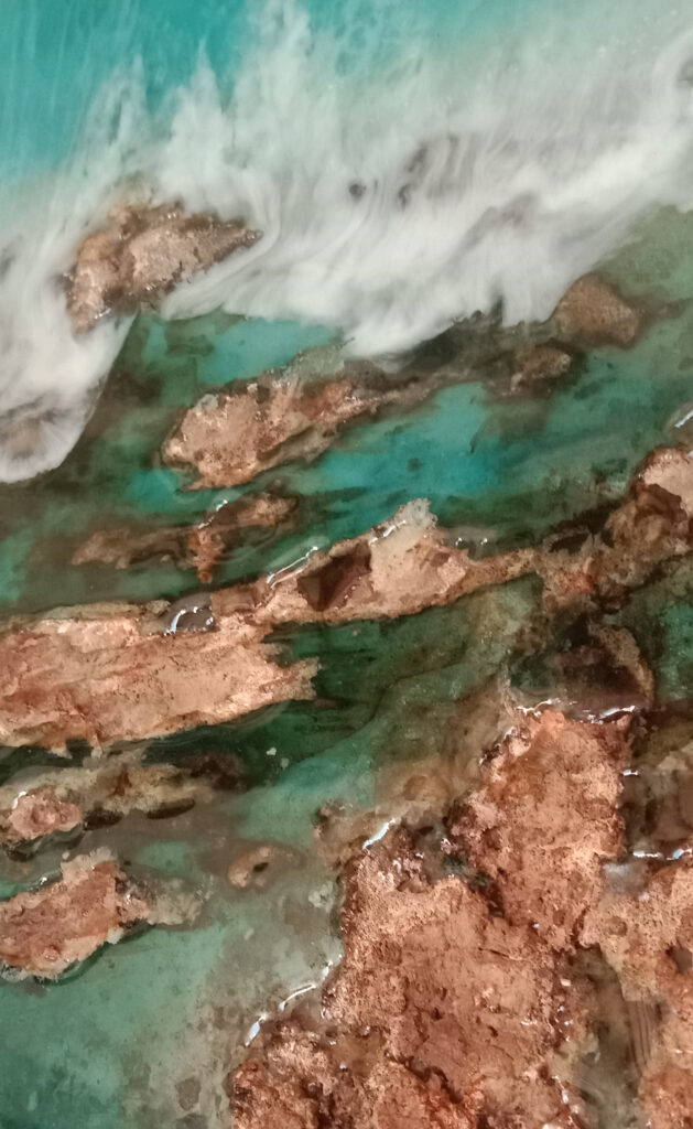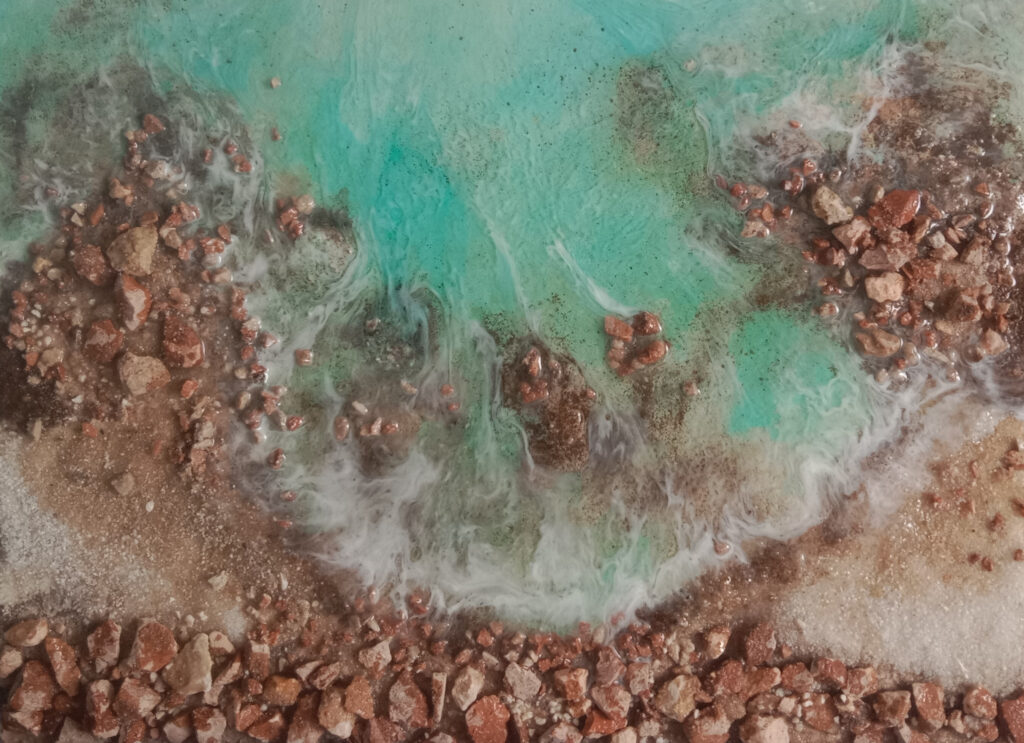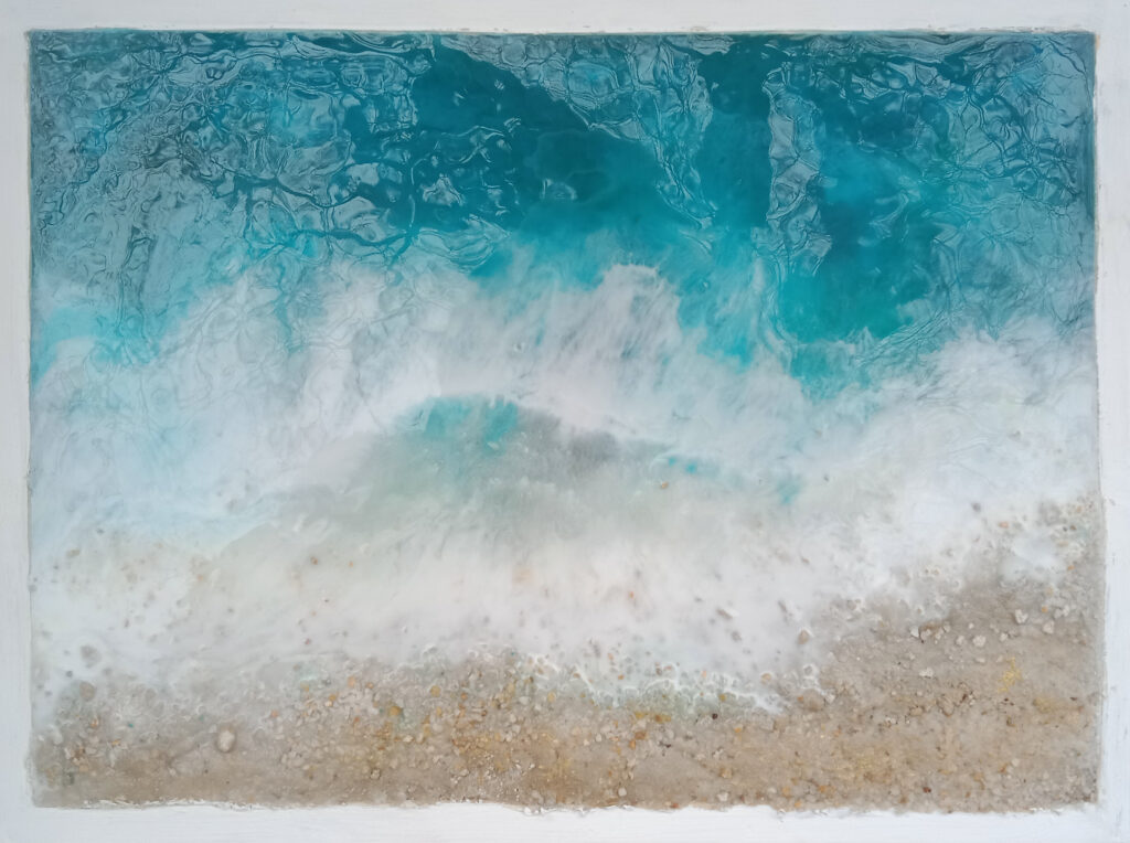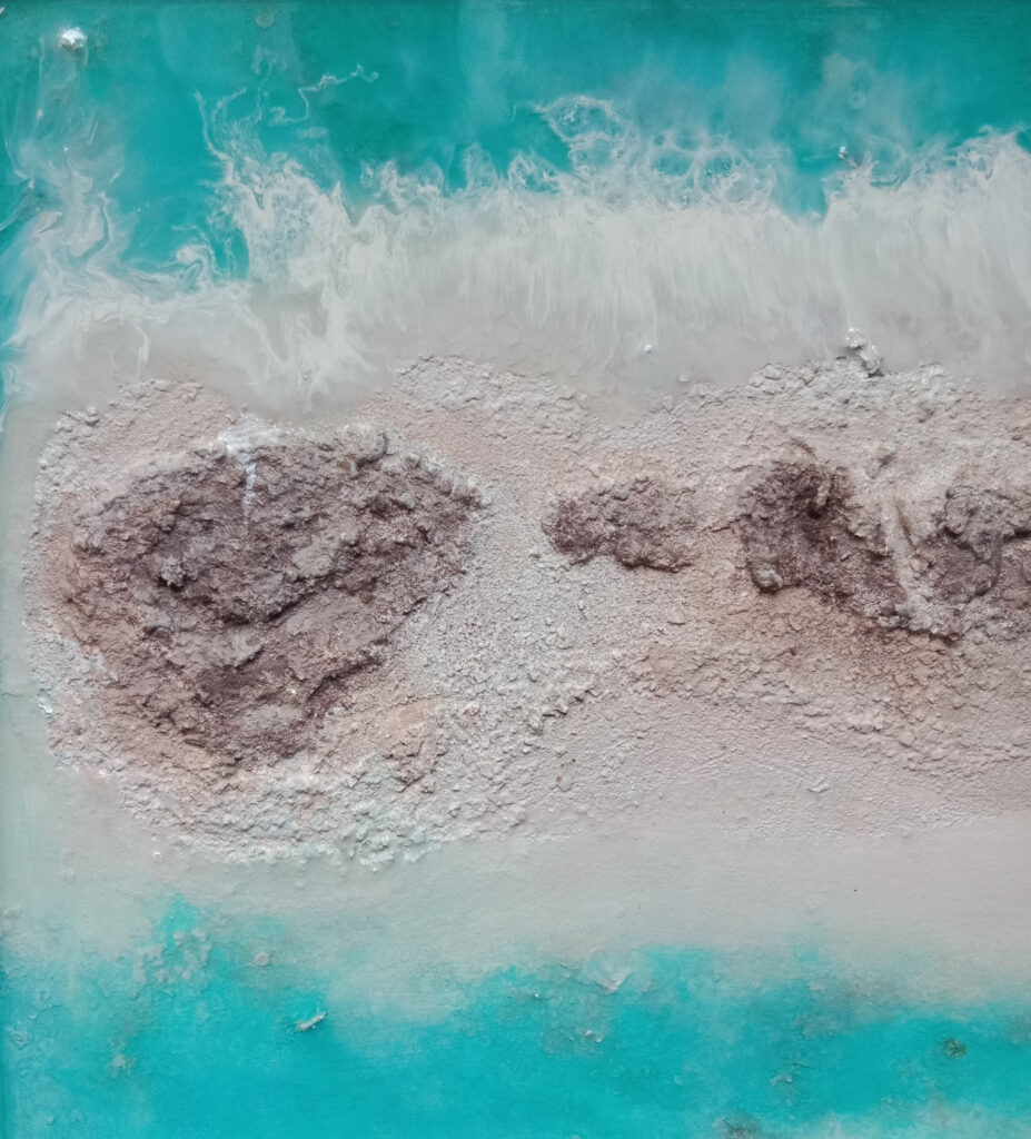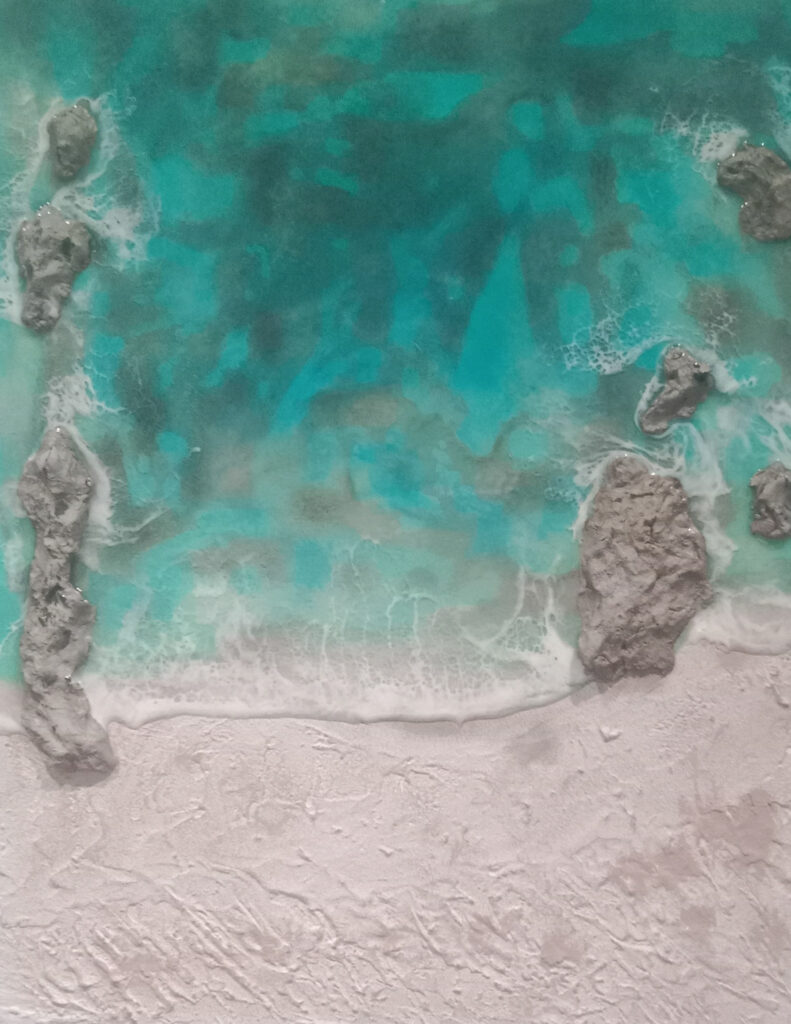 Cuadros con los cinco sentidos puestos en el mar realizados en resina epoxi y ocasionalmente objetos de decoración de resina ecológica, Jesmonite y cemento.